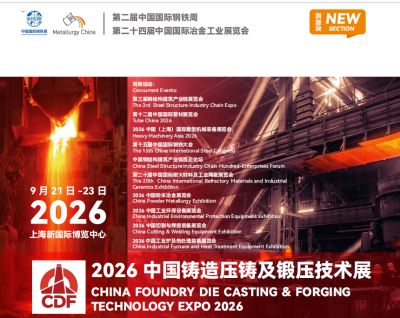 2026中国铸造压铸及锻压技术展览会 时间:2026年9月21-23日 地点:上海新国际博览中心 智能制造 绿色发展